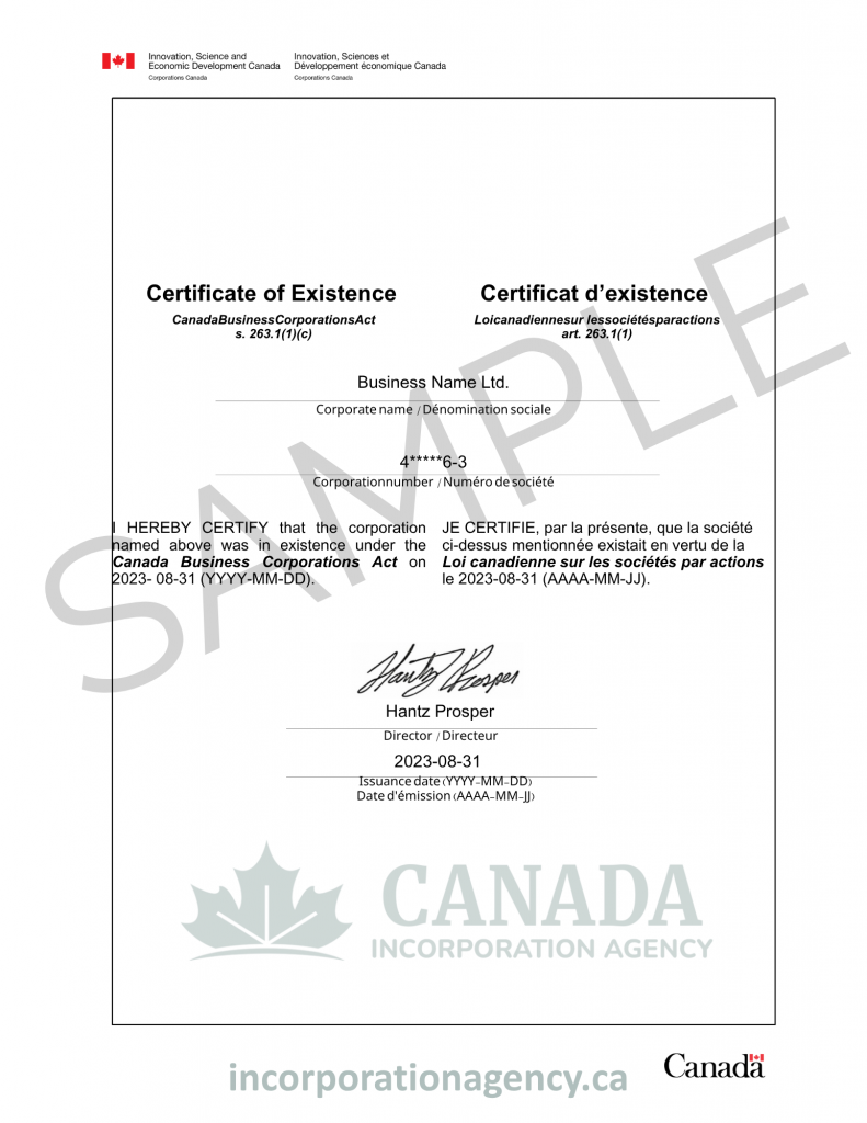 The certificate includes your corporation name, incorporation/registration number, incorporation date, registered office address, and confirmation that the corporation is in good standing with required filings. Some jurisdictions also include director information and share capital details.