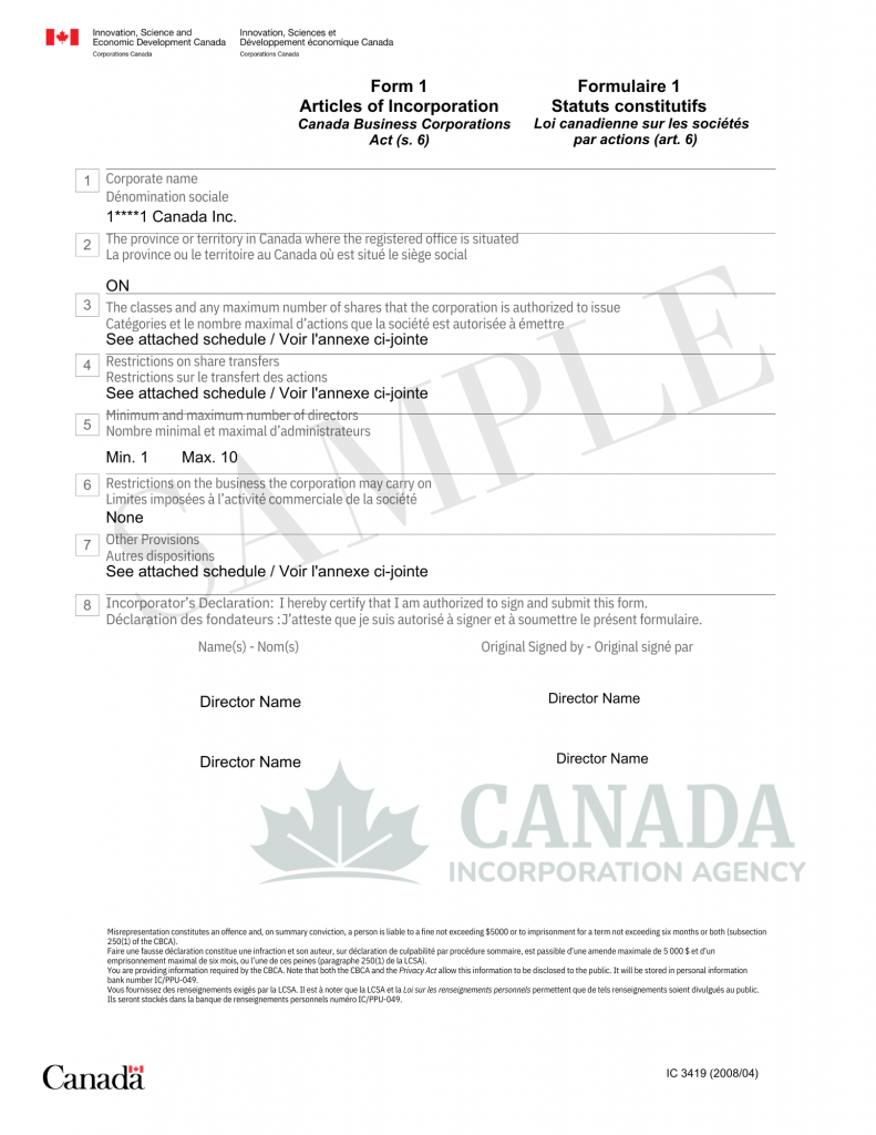 To incorporate federally, you will be required to file your Articles of Incorporation with Corporations Canada, decide if you will be a numbered or a named company, and provide information such as directors and a Canadian address. If you’re deciding on a name, you will also require a NUANS report.
